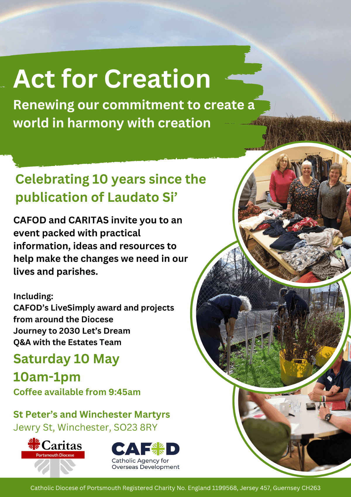 To celebrate the 10th anniversary of the publication of Laudato Si’ by Pope Francis, on Saturday 10th May, 10am-1pm, CAFOD and CARITAS in Portsmouth are holding a joint event at St Peter’s, Winchester) that will be packed with practical information of how we can make a difference in our lives and that of our parish. There will be short talks from parishes working on the CAFOD’s Live Simply Award, as well as other projects from around the diocese. You will participate in the Let us Dream activity from Journey to 2030. A member of the Diocese estates team will be there to answer questions you may have about how your parish might become more energy efficient, along with case studies. There will be information on waste, food, and biodiversity and lots of ideas and resources to take back to help your parish celebrate Laudato Si’ week later in the month.