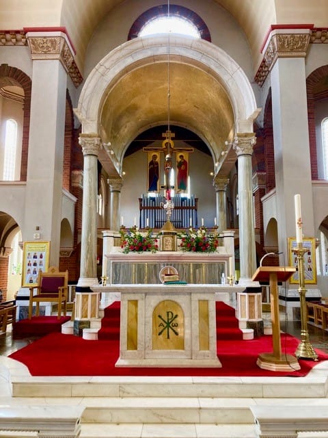 - It retains the majority of its good quality interior, including the sanctuary where a baldacchino supported by Cippolino marble columns has a barrel-vaulted canopy of gold mosaic and marble decoration. The communion rail is of white marble with colonnaded twin columns of Siena marble and the high altar is richly appointed including hanging rood figures above, all by Messrs Marchetti of Portsmouth.