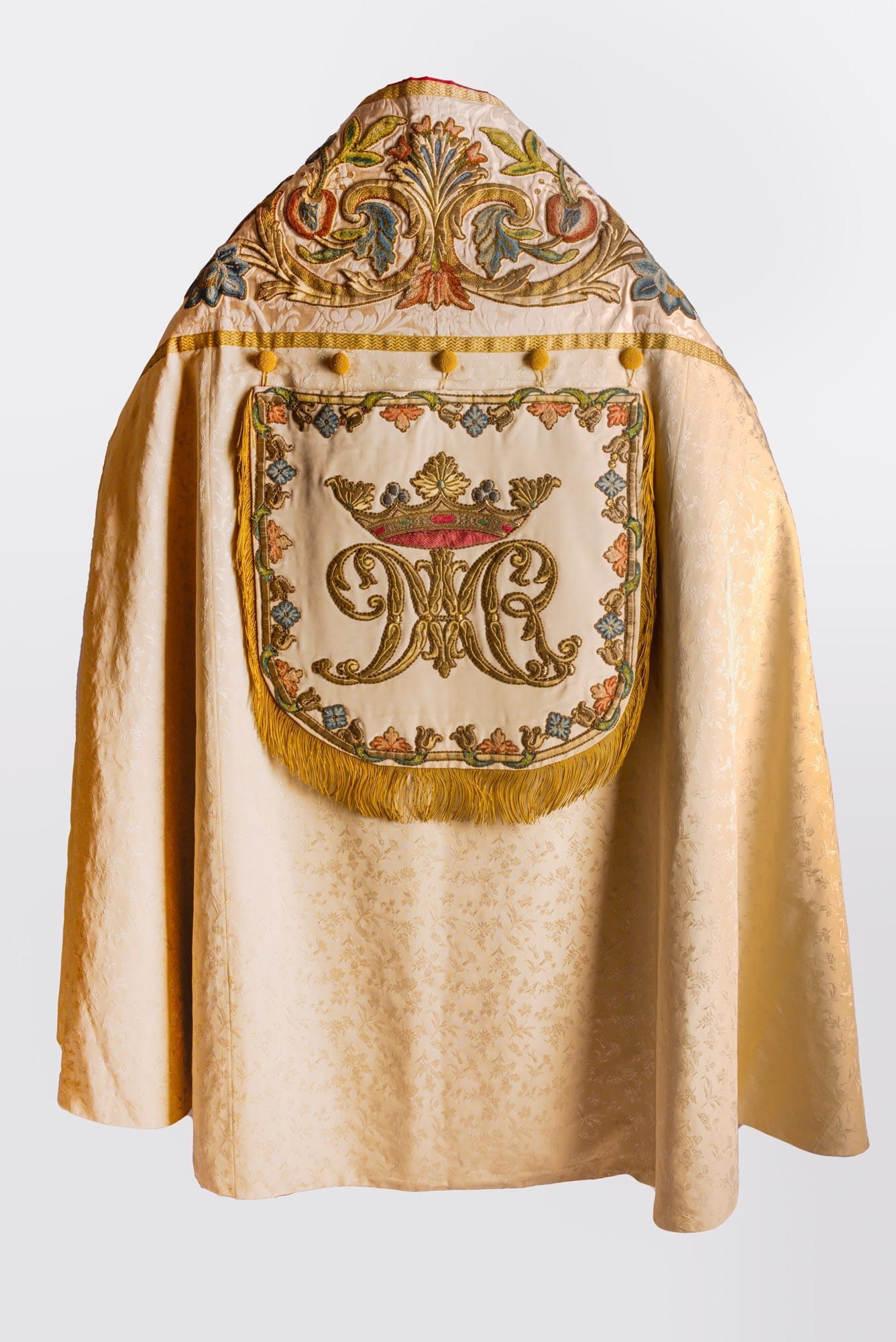 The full-length cloak is formed from a semi-circular piece of cloth, it is open at the front and is fastened at the breast by hooks or a brooch. It is made of silk or other rich material in assorted colours.The cope’s origins and story thereafter narrate a fascinating 17th-century tale of Catholic persecution in England and abroad.