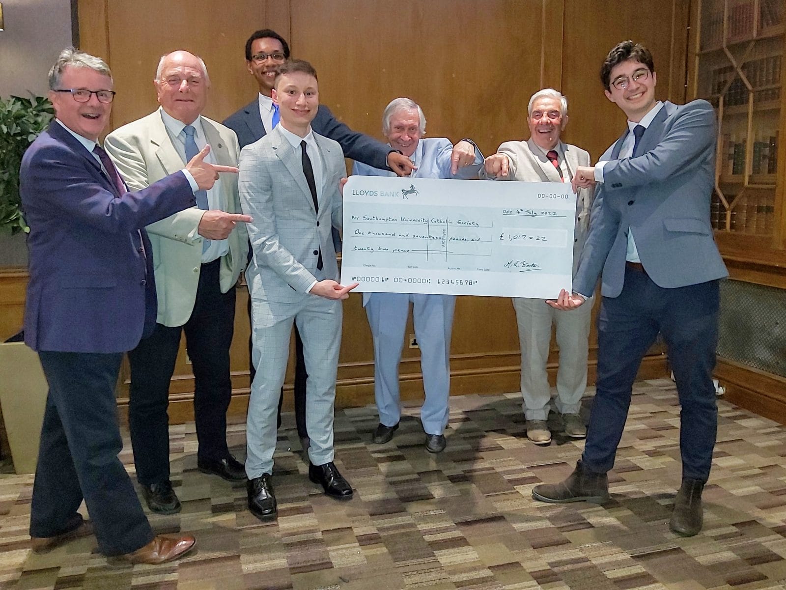 | The Southampton Catenian Circle has a longstanding affiliation with Southampton University CathSoc students with an annual tradition to hold a fundraising barbecue for the students’ annual pilgrimage. Retired restauranteurs, Daverio and Helen Matteucci, once again kindly hosted the event in their garden. The barbecue skills of Daverio and fellow Catenians, Roger Lillie, Grand National President and Brother Harry Harrison, were certainly put to the test this year, cooking on a very warm summer’s afternoon for over 60 people. The University students contributed with serving and washing up duties. The Students pilgrimages are overseen by the Sisters of Verbum Dei and Southampton University Chaplain, Sr. Emiliana, who was a guest at the event. The occasion was well supported by Catenians from across Hampshire, and the Southampton Circle were delighted to present Southampton CathSoc with a cheque for an amazing £1,017 towards their pilgrimage. The students are shortly heading to Rome where they will assist Italian social workers with projects supporting the city’s homeless and refugees. |