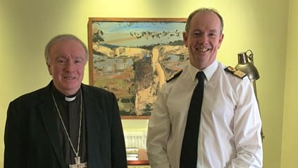 One of the great joys of being the Bishop of this Diocese of Portsmouth is the presence of the Royal Navy (RN), above all here in Portsmouth itself. I met with Commodore John Voyce who since last summer has been the commander of the naval dockyard. Until last year, Commodore Voyce was based in Gosport where he was the Commanding Officer of HMS Sultan, the RN’s marine and air engineer establishment. This followed an extensive and varied career as a Marine Engineering Officer, including two years in charge of the engineering department on aircraft carrier HMS Illustrious. The Naval base he commands in Portsmouth supports the two new 65,000-tonne Queen Elizabeth-class aircraft carriers as well as the entire flotilla of Type 45 destroyers, around half the Frigate Force, Offshore Patrol Vessels, Hunt-Class minehunters and P2000 patrol boats, and a wide range of defence organisations that operate from here. Over 10,000 people work in marine-related professions, serving personnel, civil servants, employees of firms such as BAE Systems, KBS Maritime, SODEXO & SERCO and contractors supporting the activities of the Fleet.